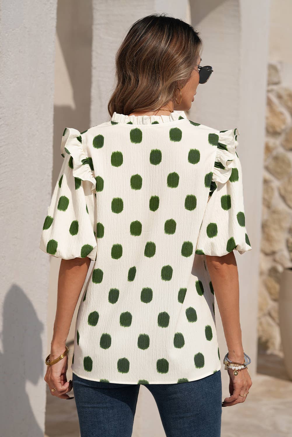 Playful, chic, and oh-so-fun — this top is your new go-to for standing out in style. Designed with a creamy ivory base and bold pink polka dot print, it’s equal parts whimsical and sophisticated. The smocked yoke and split neckline add a touch of effortless detail, while the ruffle trim shoulders and short flutter sleeves bring the perfect feminine flair.